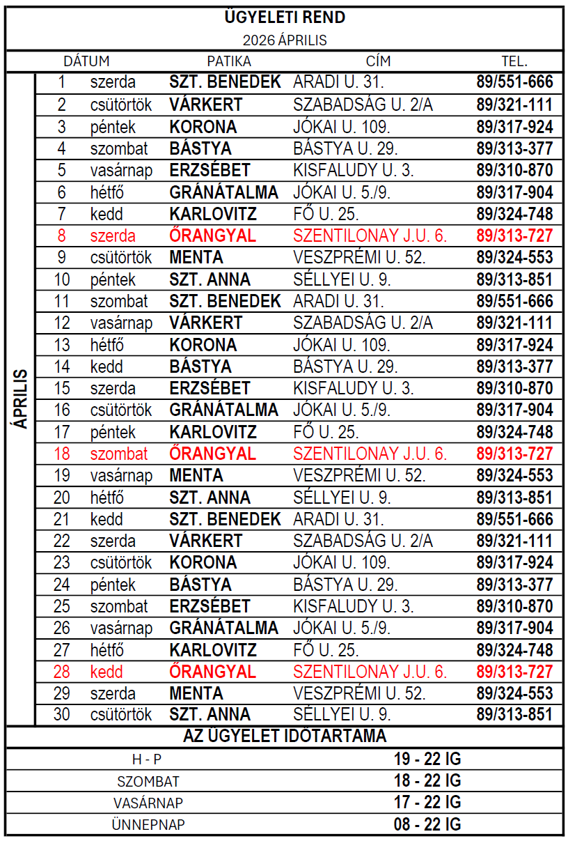 Gyógyszertárak ügyeleti rendje - 2026 április